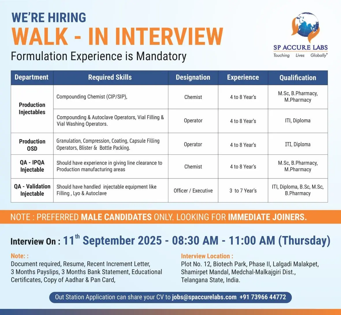 SP Accure Labs hiring for Production (Injectables/OSD) & QA roles. Walk-in on 11 Sept 2025 at Telangana. Experience: 3–8 years. Apply now.