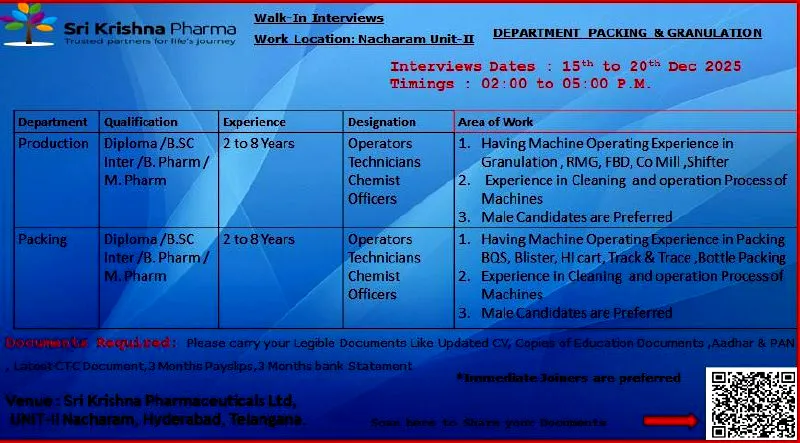 Sri Krishna Pharma has announced multiple walk-in interview opportunities for experienced professionals across Production, Packing, and Biologics Manufacturing units. These openings span oral solid dosage (OSD) formulation manufacturing at Nacharam Unit-II and biosimilar monoclonal antibody (MAbs) manufacturing at the company’s Clonz Biotech facility in Genome Valley, Shameerpet. This hiring drive is ideal for candidates seeking stable careers in pharmaceutical manufacturing and biopharmaceutical production within a GMP-regulated environment.