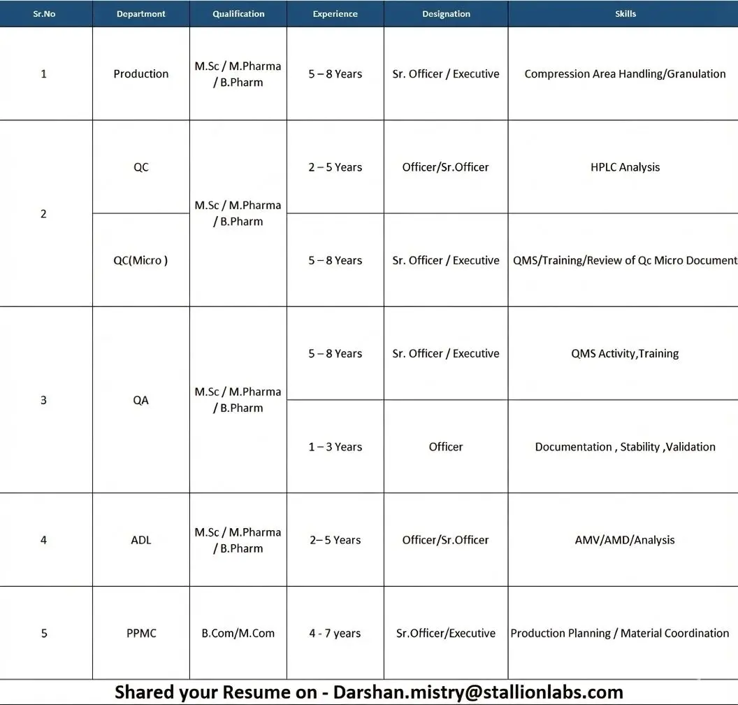 Stallion Laboratories hiring Production, QC, QA, ADL, PPMC professionals. Multiple vacancies for B.Pharm, M.Pharm, MSc with 1–8 years experience.