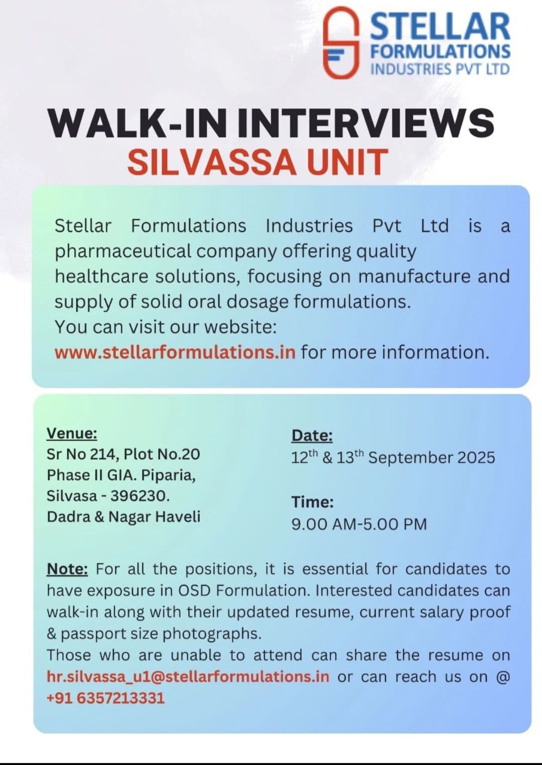 Attend walk-in interviews at Stellar Formulations, Silvassa on 12th & 13th Sept 2025. Openings for pharma professionals with OSD formulation experience.