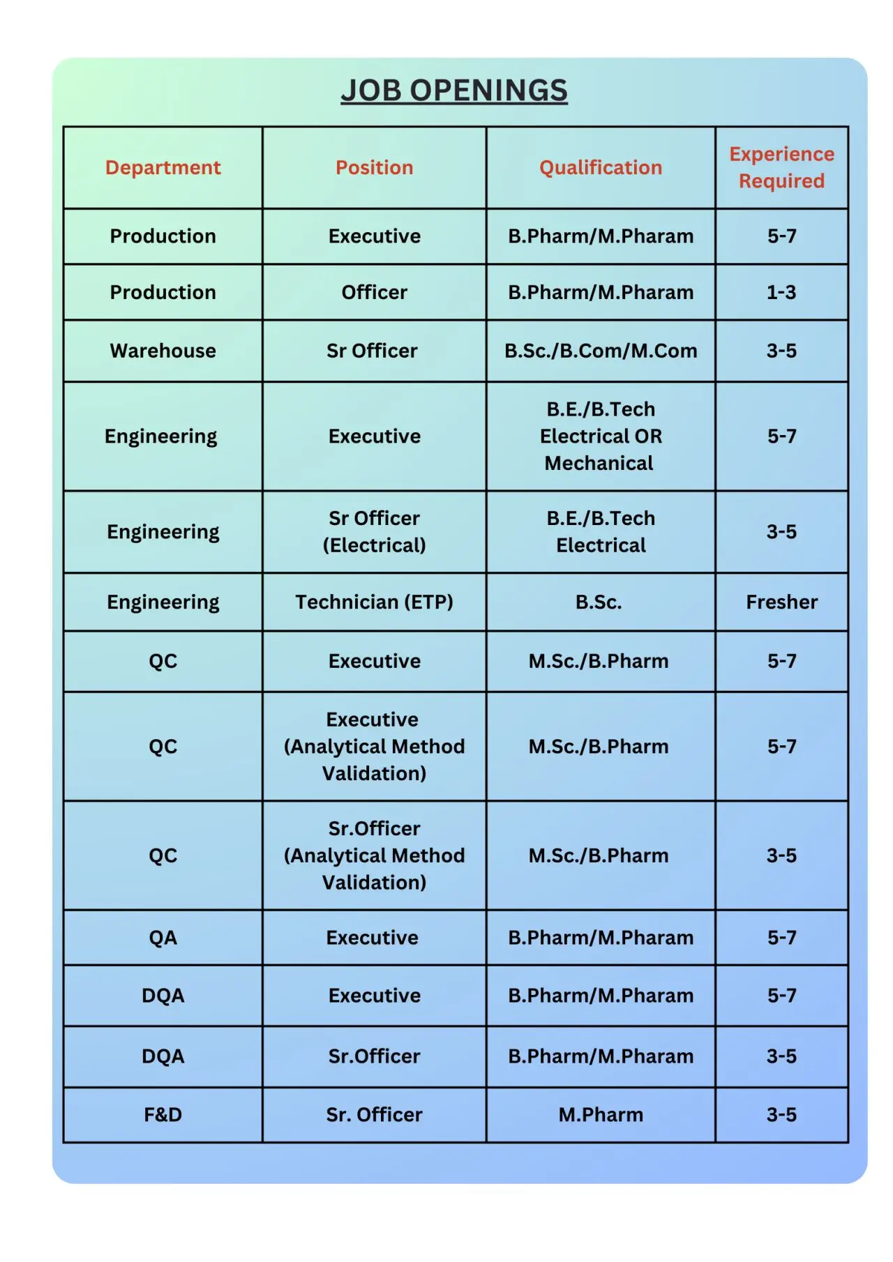 Candidates with hands-on experience in OSD formulations who are seeking stable roles, technical growth, and long-term career progression in pharmaceutical manufacturing are encouraged to attend.
