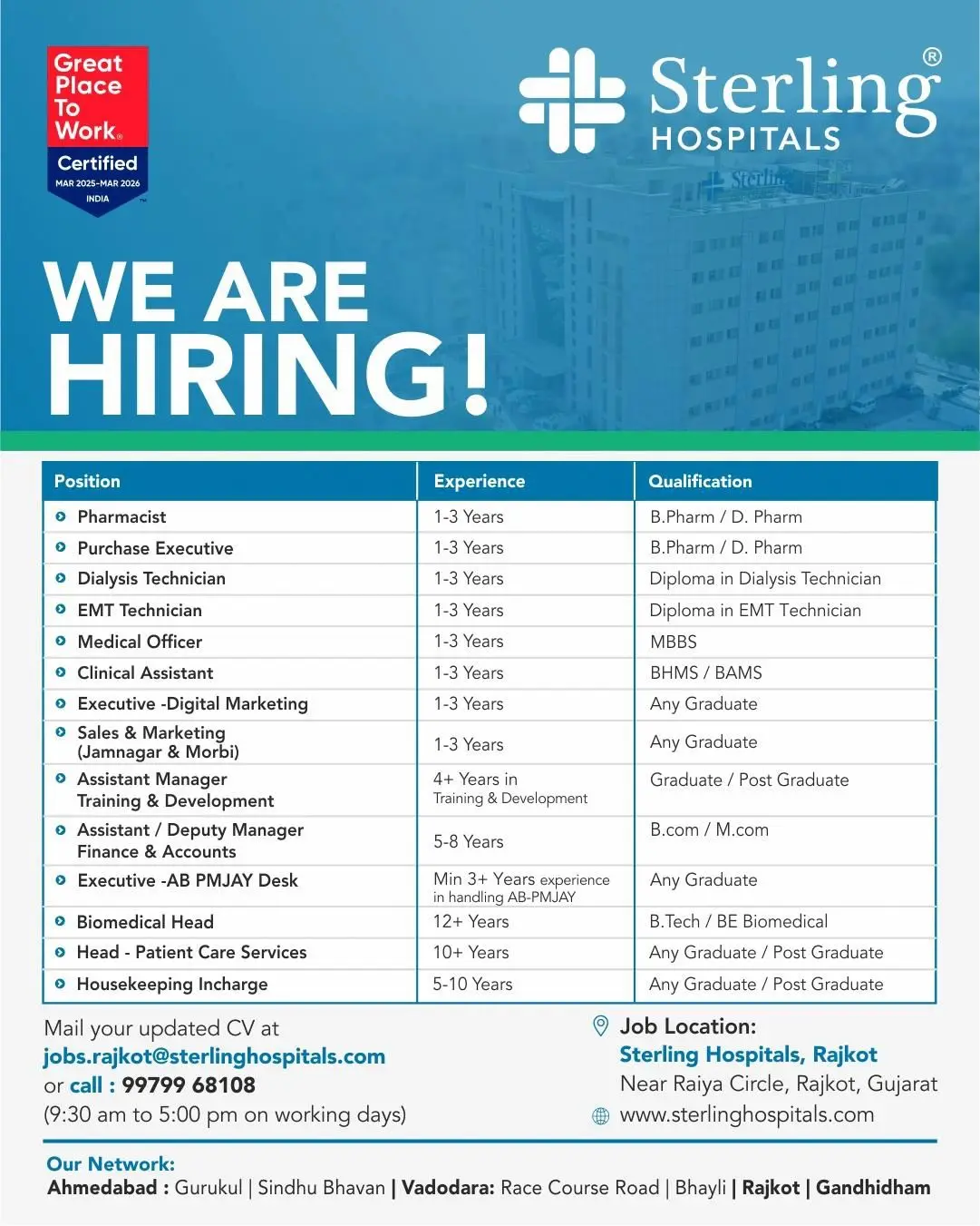 Interested candidates can send their updated CVs to jobs.rajkot@sterlinghospitals.com or contact +91 99799 68108 between 9:30 AM to 5:00 PM on working days.