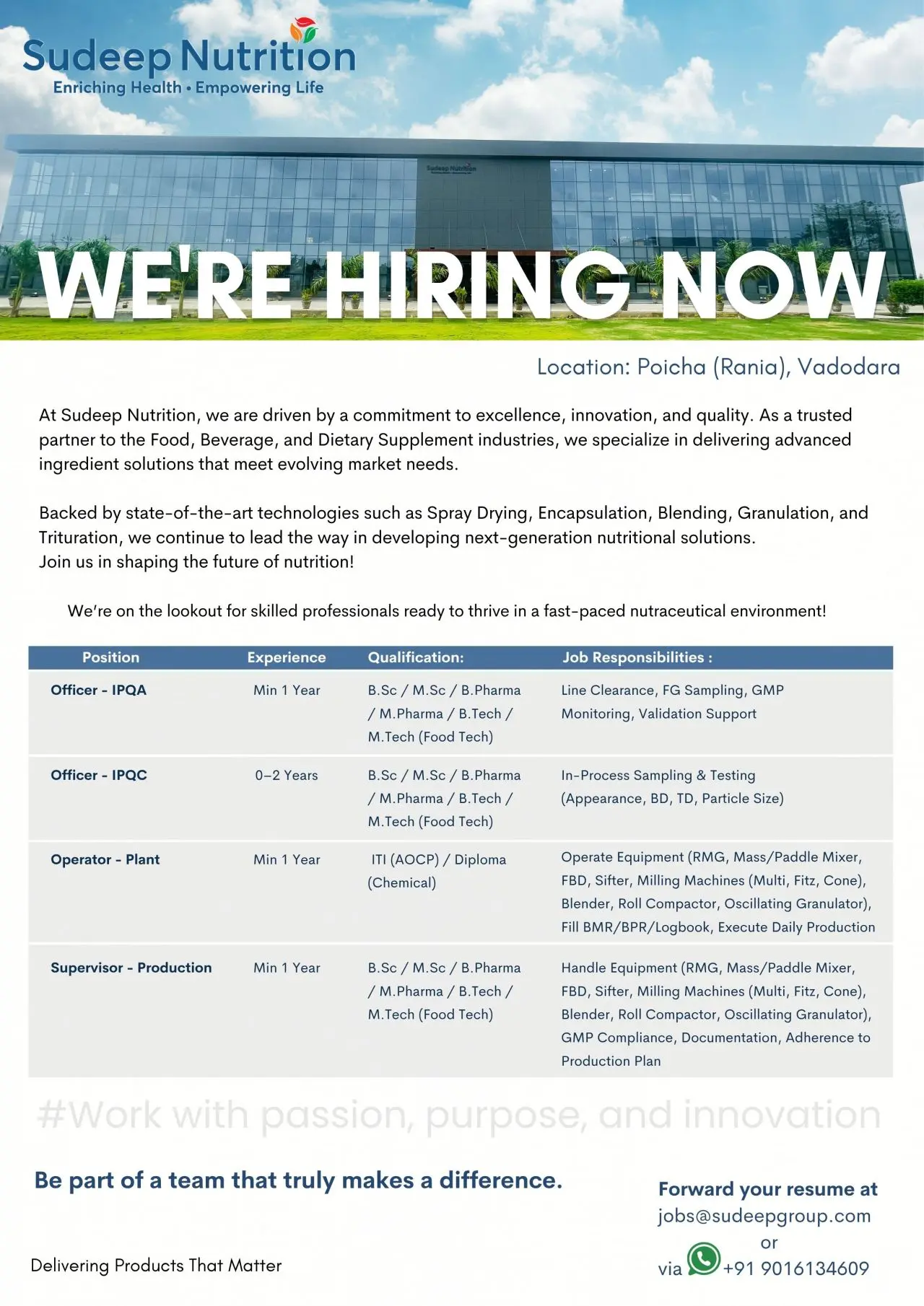 Are you passionate about making a real impact in the food and nutraceuticals industry? Sudeep Nutrition, a trusted name in ingredient innovation, is actively hiring dynamic professionals to join its manufacturing operations at Poicha (Rania), Vadodara. With a strong reputation for quality and cutting-edge technology in Spray Drying, Encapsulation, Blending, Granulation, and Trituration, Sudeep Nutrition offers a stimulating work environment focused on health, safety, and innovation.