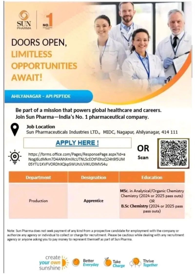 Sun Pharma hiring Chemistry Apprentices in Ahilyanagar. MSc, BSc Chemistry 2024–2025 pass-outs eligible. Apply online.