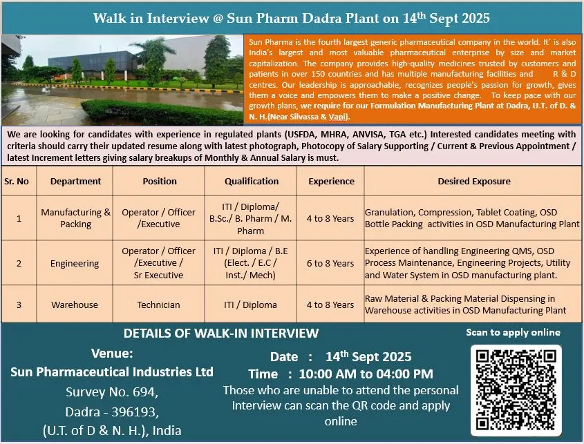 Sun Pharmaceutical Industries Ltd., India’s largest and most valuable pharmaceutical company and the world’s fourth largest generic drug manufacturer, is conducting a Walk-in Drive for multiple positions in Manufacturing, Packing, Engineering, and Warehouse departments at its Dadra plant (near Silvassa & Vapi). This is an excellent opportunity for experienced pharma professionals to work with one of the most trusted names in healthcare.