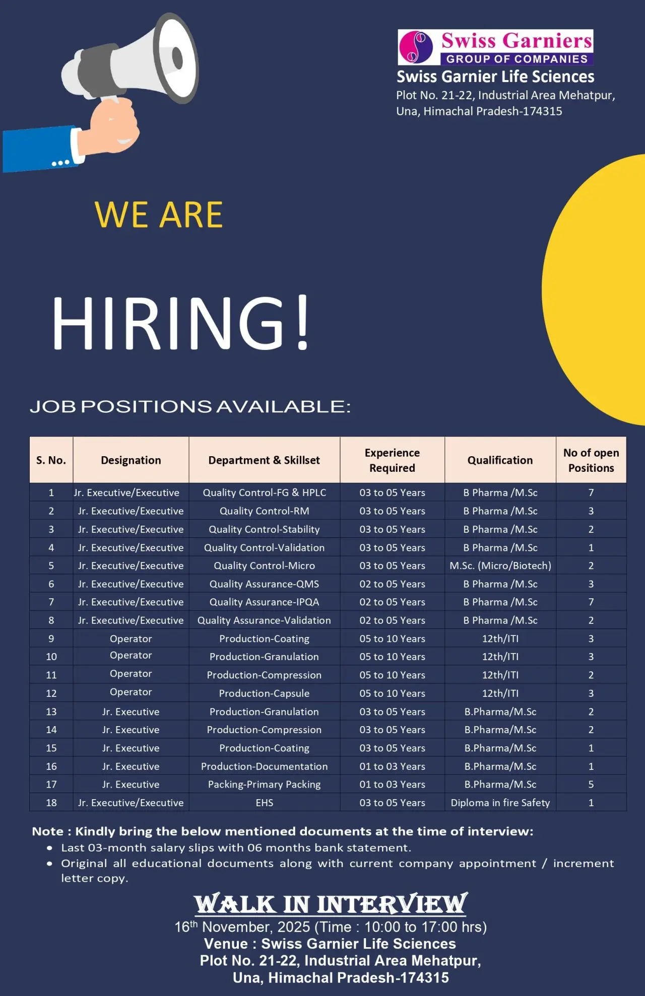 Walk-in interview at Swiss Garnier Life Sciences, Himachal Pradesh on 16 Nov 2025 for QC, QA, Production, and EHS roles. Apply now!