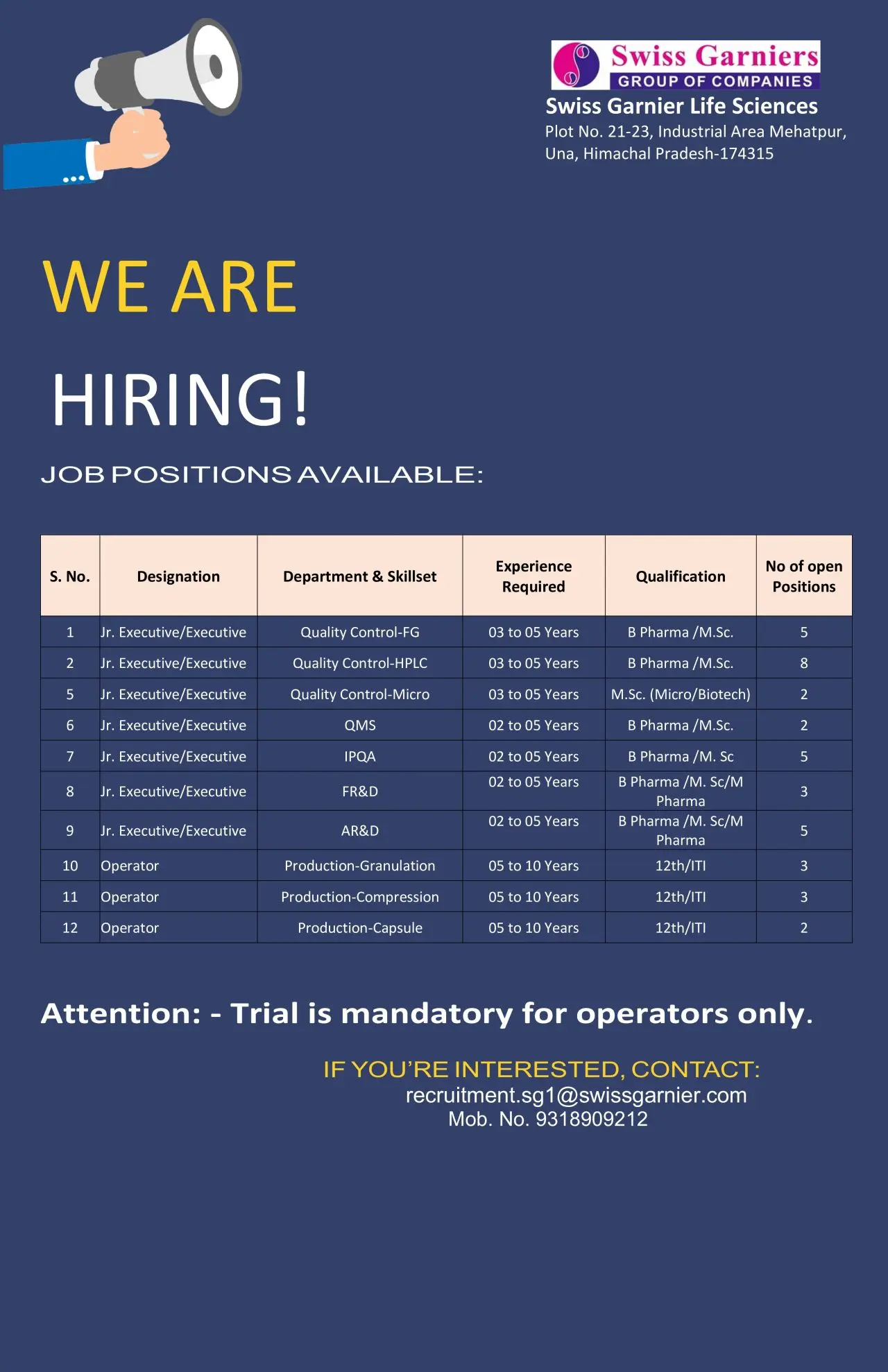 Swiss Garnier Life Sciences Hiring 35+ Pharma Professionals Across QC, QA, R&D & Production Roles in Himachal Pradesh
