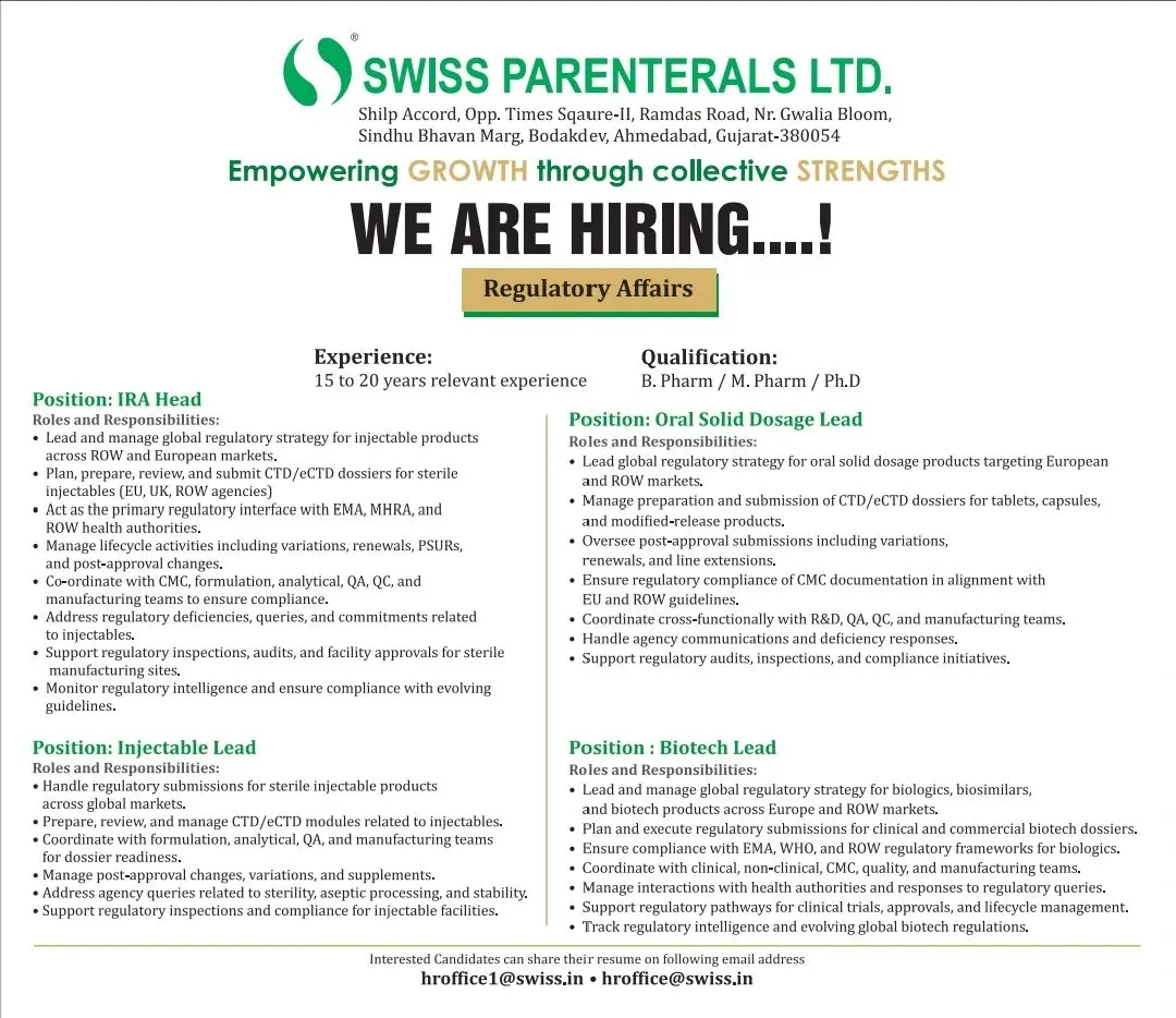 Swiss Parenterals Ltd. is hiring senior regulatory leadership professionals to strengthen its global Regulatory Affairs function at its corporate location in Ahmedabad, Gujarat. These openings are designed for highly experienced professionals who can lead complex regulatory strategies across injectable, oral solid dosage, and biotechnology portfolios for European and ROW markets.