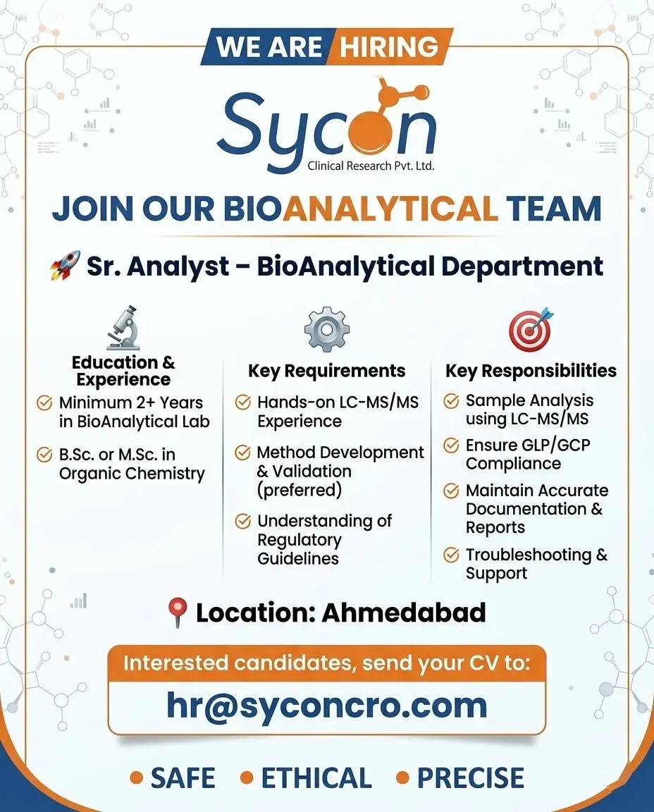 Sycon Clinical Research Pvt. Ltd. is actively hiring for the Bioanalytical Department with openings for Senior Analyst roles. This opportunity is ideal for candidates with hands-on LC-MS/MS experience and a background in organic chemistry. Candidates with a minimum of 2+ years of experience in bioanalytical laboratories are encouraged to apply. The job location is Ahmedabad, offering a strong career pathway in clinical research and bioanalytical science.