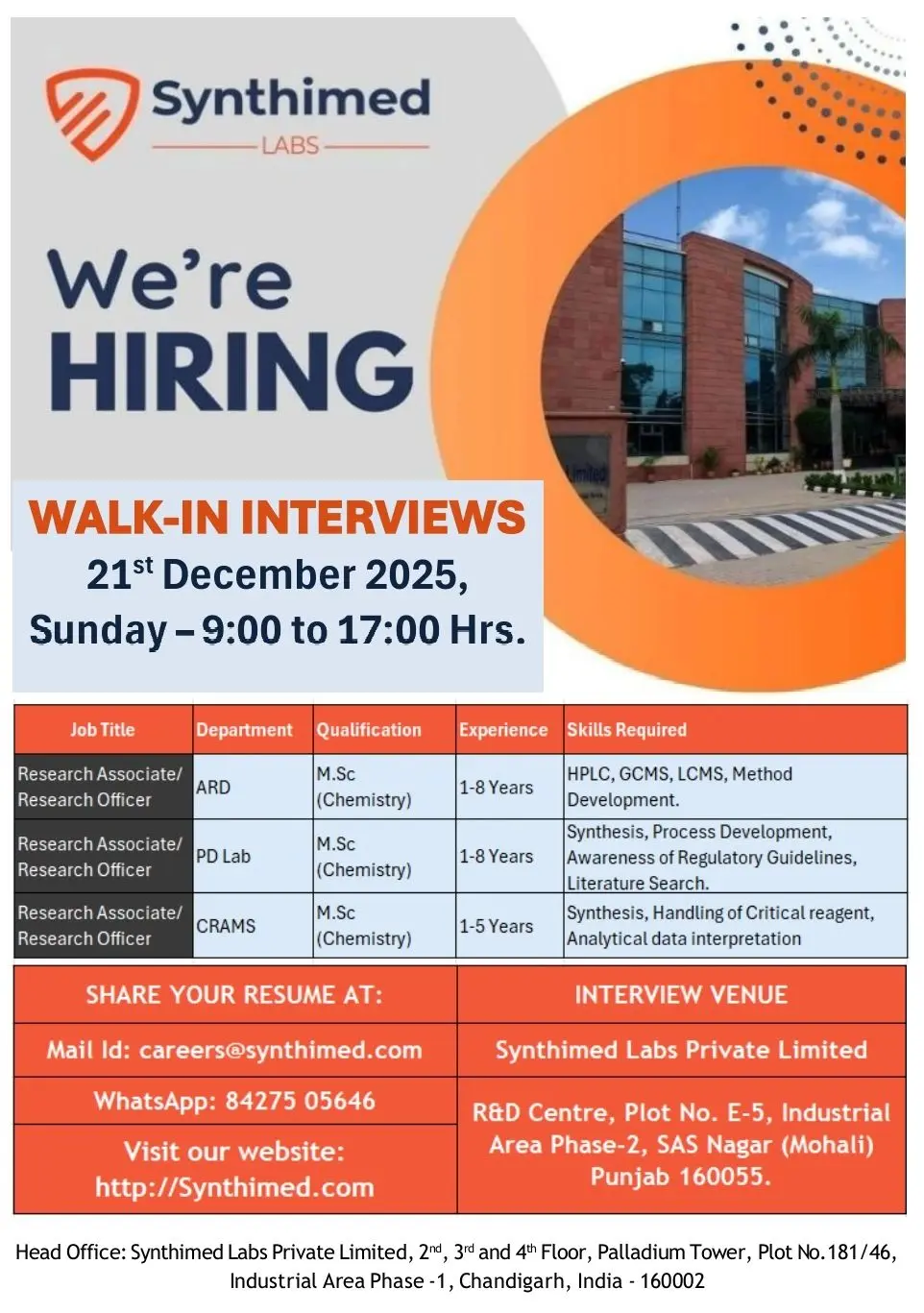 Synthimed Labs Research Associate Jobs MSc Chemistry | MohaliMeta Description: Synthimed Labs hiring Research Associates/Officers in ARD, PD Lab, and CRAMS. Walk-in interview for M.Sc Chemistry candidates in Mohali.