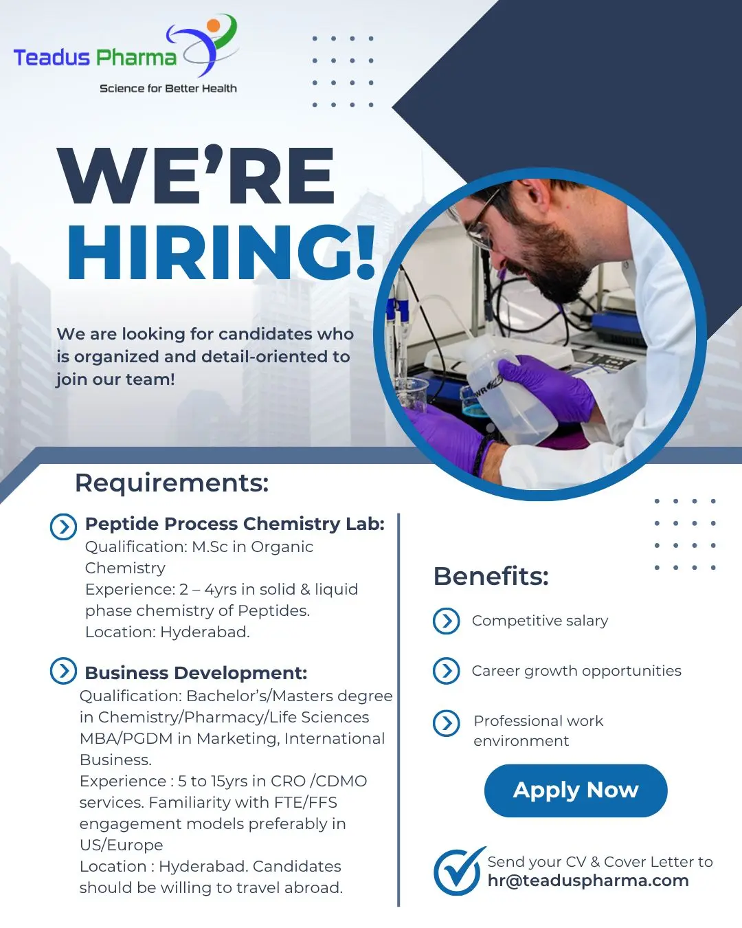 Teadus Pharma is hiring MSc Chemistry, B Pharm, MBA graduates in Hyderabad for Peptide Process Chemistry and Business Development roles. Apply now and grow your pharma career.