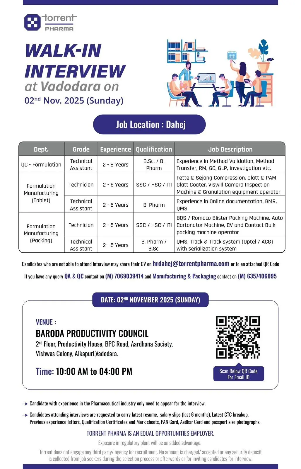 Torrent Pharmaceuticals Ltd., one of India’s most trusted pharma giants, is inviting skilled professionals to join its Dahej facility in the Formulation Manufacturing and Quality Control departments. This walk-in drive at Vadodara on 2nd November 2025 (Sunday) offers excellent opportunities for experienced candidates to grow in a high-quality, regulated environment.