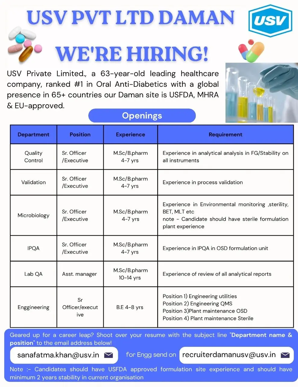 All positions are based at USV’s Daman site, a globally approved formulation facility.