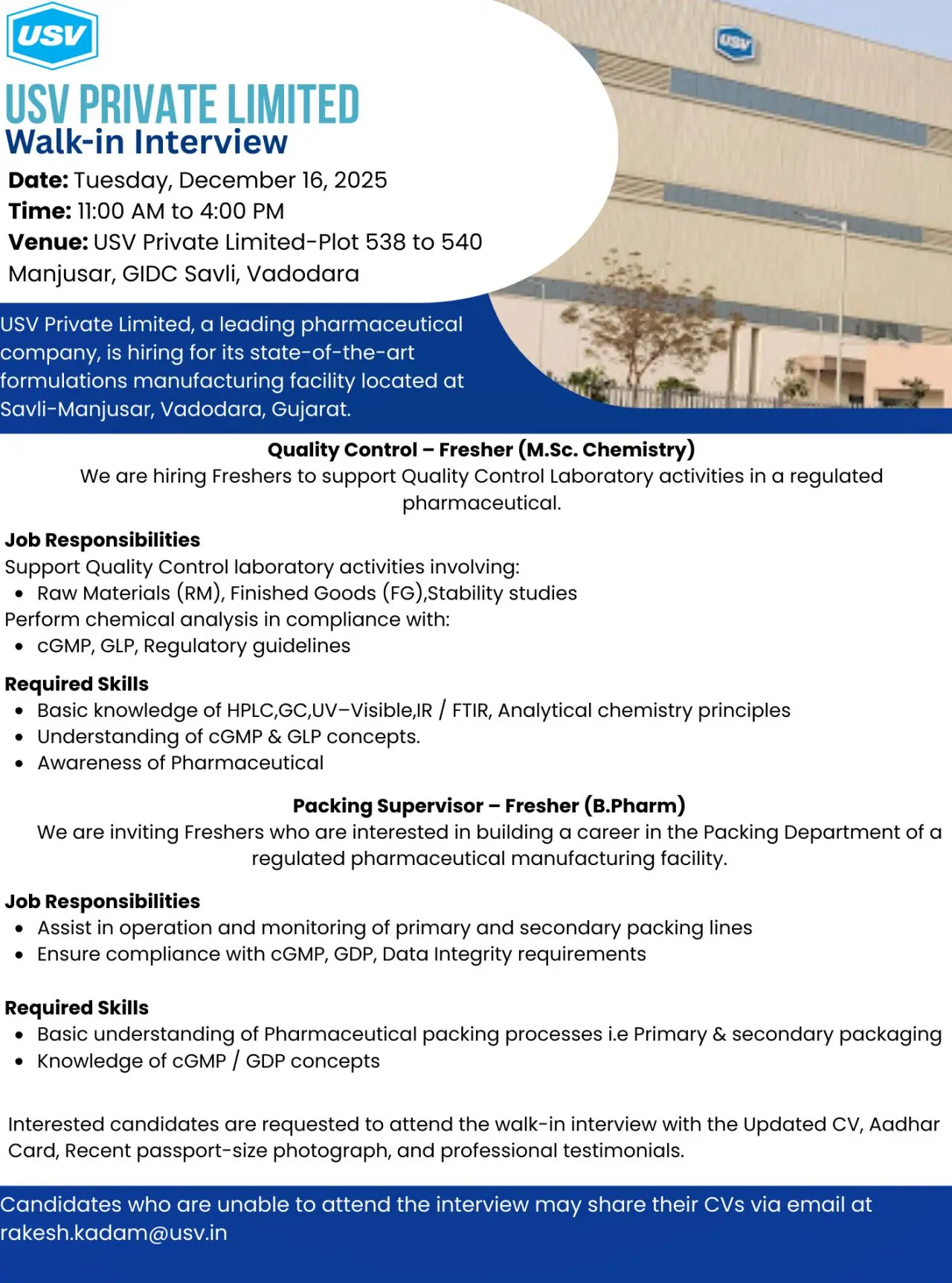USV hiring freshers for QC and Packing at Savli-Manjusar, Vadodara. Openings for MSc Chemistry and B.Pharm. Walk-in on 16 Dec 2025.