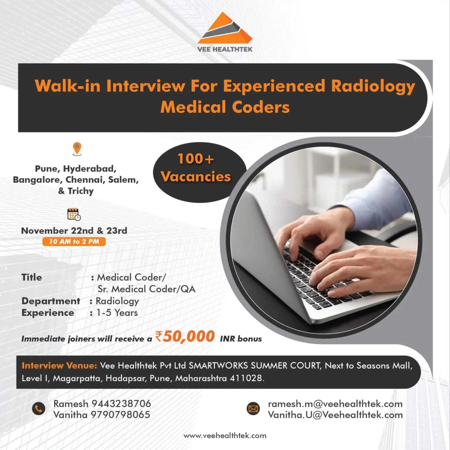 Meta Description: Vee Healthtek hiring 100+ Radiology Medical Coders across 6 cities. Walk-in 22–23 Nov. 1–5 yrs exp. ₹50,000 bonus for immediate joiners.