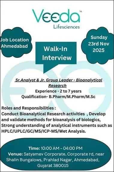 Veeda Lifesciences is conducting a walk-in drive in Ahmedabad for experienced candidates in bioanalytical research. The openings are ideal for candidates who have hands-on experience with analytical technologies, method development, and regulated laboratory workflows. If you are looking to advance your technical career in a high-performing CRO environment, this walk-in offers a direct opportunity to join a leading player in clinical and bioanalytical services.