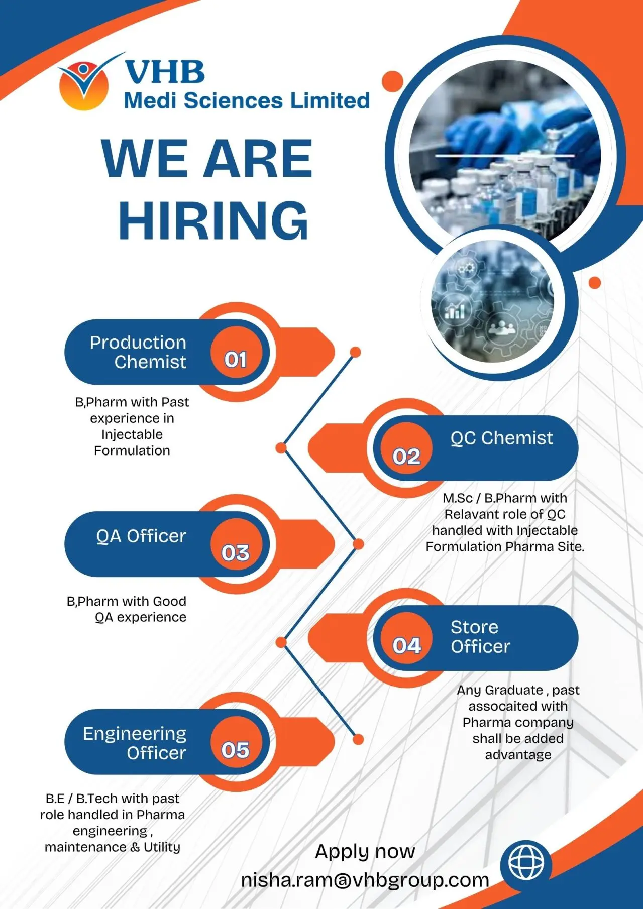 VHB Medi Sciences Ltd, a renowned name in injectable pharmaceutical formulations, is hiring across multiple departments for experienced professionals. Candidates with educational qualifications such as B Pharm, MSc, and B.Tech and relevant industry experience are encouraged to apply. These opportunities are ideal for those seeking pharma production jobs, QA/QC officer jobs, and pharma engineering careers in India.