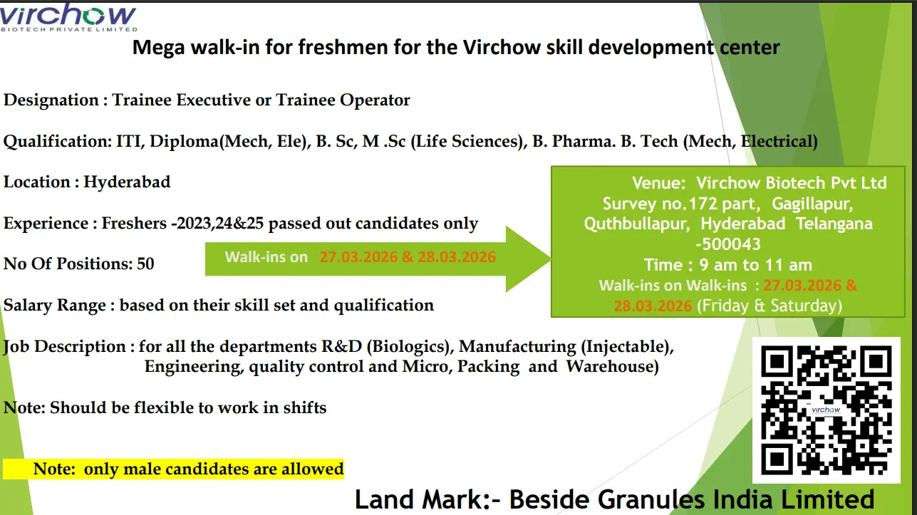 ITI, Diploma, BSc, BPharm freshers hiring for 50 roles at Virchow Biotech Hyderabad. Trainee roles. Walk-in 27–28 March 2026.
