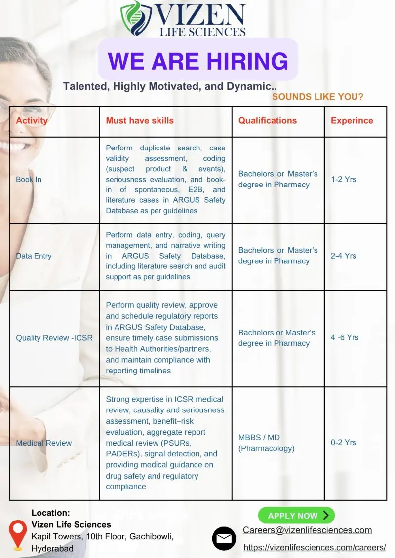 Apply for Pharmacovigilance roles at Vizen Life Sciences, Hyderabad. B.Pharm/M.Pharm/Pharm.D graduates with PV and ICSR experience welcome.