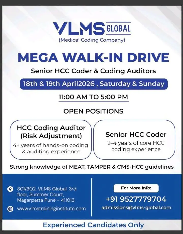 This walk-in drive includes openings for Senior HCC Coders and HCC Coding Auditors at the Pune location. Candidates with strong expertise in clinical coding, CMS-HCC guidelines, and healthcare documentation are encouraged to attend. With rising demand for healthcare data professionals, this role offers strong job stability and high earning potential.