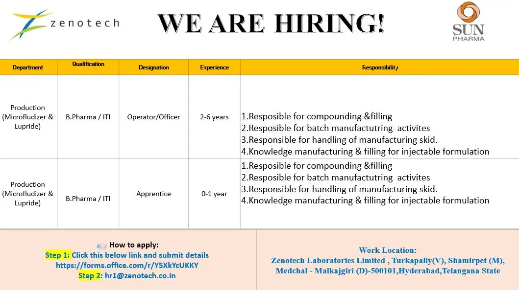 Zenotech Laboratories Limited is actively hiring for Production Operator, Officer, and Apprentice roles in injectable manufacturing. This is a strong opportunity for candidates searching for B.Pharm jobs in Hyderabad, ITI pharma jobs, and pharmaceutical production jobs in injectable manufacturing plants.